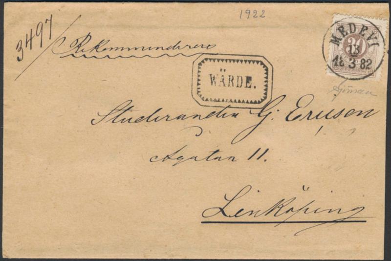 Sweden, Facit 35g or Scott 35 cover, 30 öre brown blurred print. Superb registered cover with EXCELLENT cancellation MEDEVI 13.3.1882, sent to Linköping. Certificate Sjöman (1972). 1 more image is available at www.philea.se.