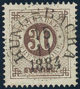 Sweden, Facit 35h or Scott 35a used, 30 öre black-brown on soft paper. EXCELLENT cancellation KUNGSBACKA 15.11.1884.
