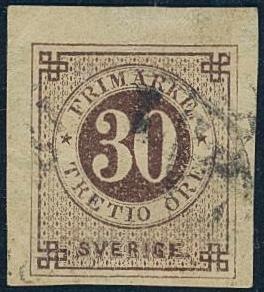 Sweden, Facit 35v1 or Scott 35b used, 30 öre brown, imperf variety, with three wide margins. Small fold and tear. Certificate HOW 1, 3, 1 (2011). F 25000 1 more image is available at www.philea.se.