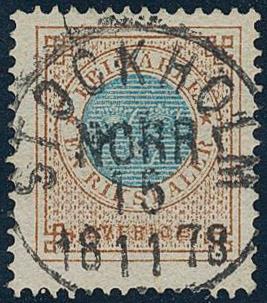 Sweden, Facit 37 or Scott 37 used, 1 Riksdaler brown/blue. Superb example cancelled STOCKHOLM NORR 15.11.1878. Certificate HOW 4. 3. 5 (1999). F 8000 1 more image is available at www.philea.se.