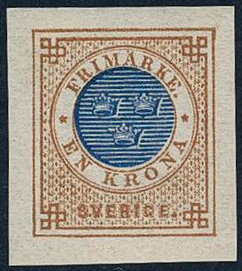 Sweden, Facit 49v1 or Scott 49a *, 1 Krona brown/blue, imperf variety. EXCELLENT.