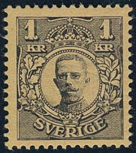 Sweden, Facit 77vm9 or Scott 72 *, 1 Krona black with parts of two inverted crowns horizontally. Extremely rare – according to Facit only one known.