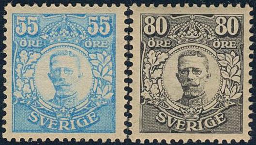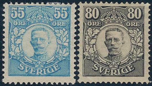 Sweden, Facit 92, 94 or Scott 90, 92 *, 55 och 80 öre (2). Cert N. Svensson 2,3,3 and HOW 2,3,4. Both with light corner crease. Two nice examples. 2 more images are available at www.philea.se