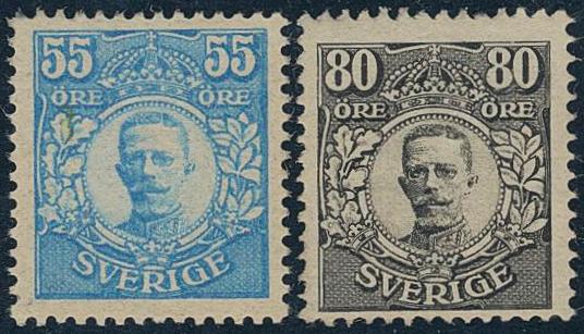 Sweden, Facit 92, 94 or Scott 90, 92 *, 55 och 80 öre (2). Superb quality.