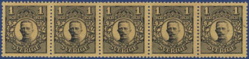 Sweden, Facit 96bz or Scott 94 **, 1 kr with watermark KPV in a beautiful strip-of five. F 14000++