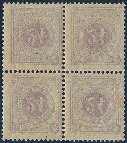 Sweden, Facit 121b v5 **, 1916 Landstorm II 10+40 / 24 öre reddish lilac in BLOCK OF FOUR, with SET-OFF on all four stamps. Very scarce variety on this stamp, previously not recorded. Exhibition item. Certificate Lorentzon 3, (4×3), 4×5) (2025). 1 more image is available at www.philea.se.