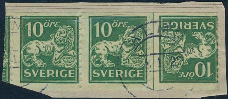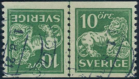 Sweden, Facit 144Av3 or Scott 118a used, 10 öre green, tête-bêche tails against each other. Canc. STOCKHOLM 1.8.21. Certificate KAN (2012). F 30000 1 more image is available at www.philea.se.