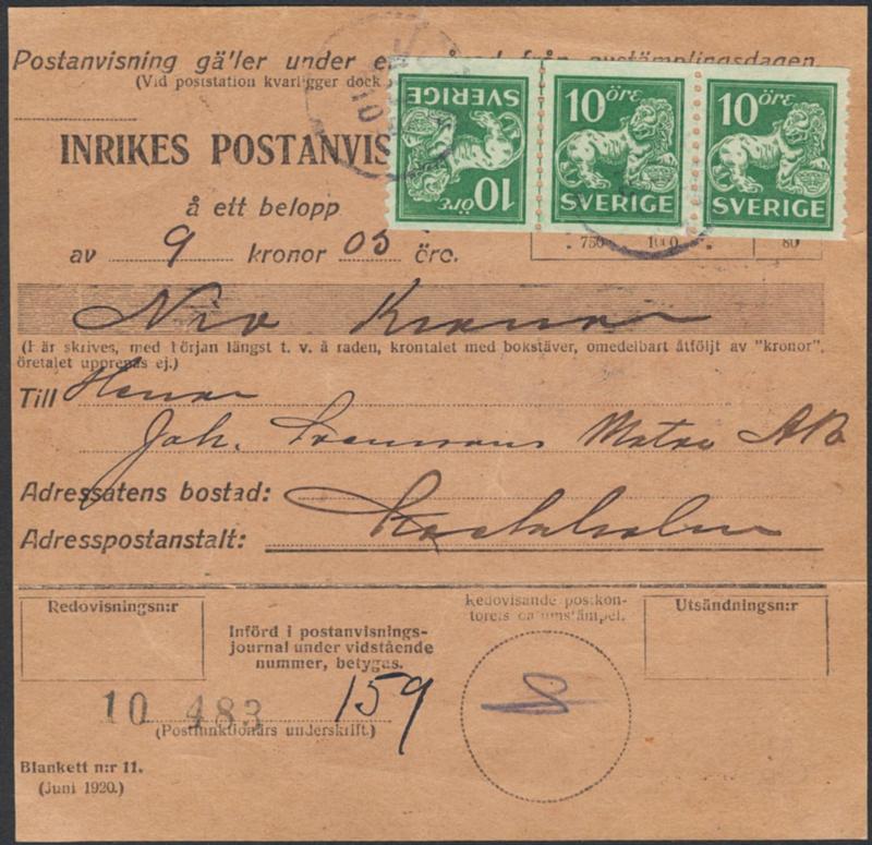 Sweden, Facit 144Av3 or Scott 118a cover, 10 öre green, tête-bêche tails against each other. Money order sent from JÖRN 17.10.1921 to STOCKHOLM 19.10.21. Certificate KAN (2019) and Lorentzon 2, 3–4, 1, 2 (2025). F 32000 2 more images are available at www.philea.se