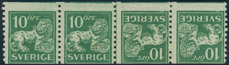 Sweden, Facit 144Av4 or Scott 118a **/*, 10 öre green, tête-bêche heads against each other with vm KPV in strip of four.Sign. BG. F 18000