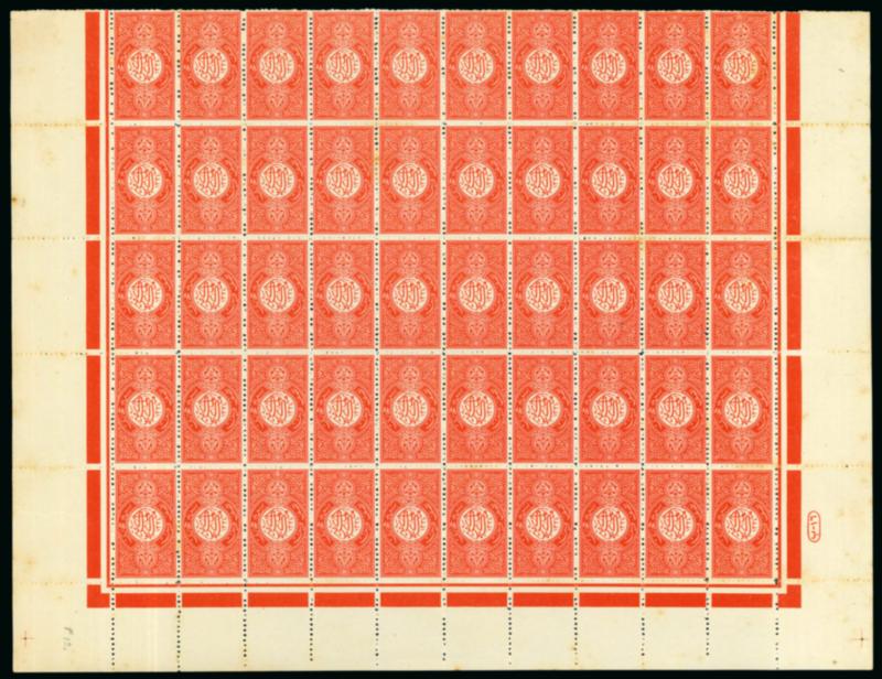 1916 1/2pi scarlet, perf 12 in complete sheet of 50 mint never hinged, without one side margin and some gum tone spots affecting many and some visible from front, cat £3750