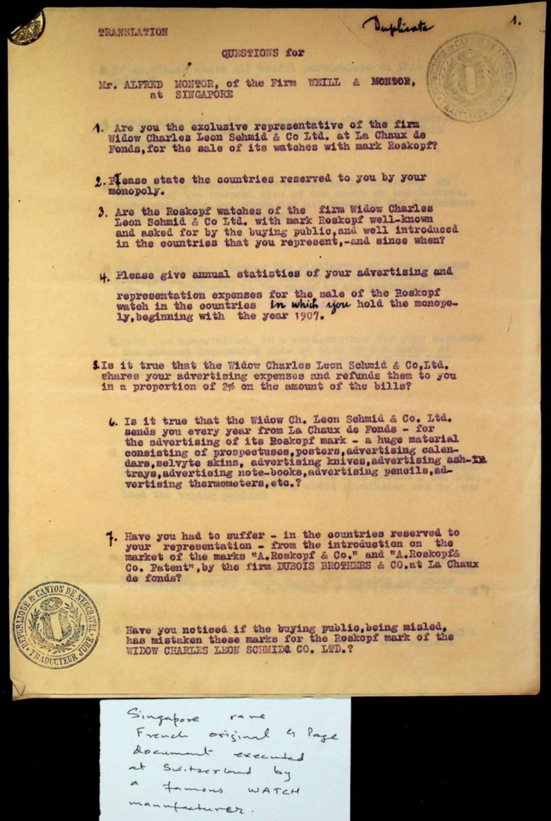 Singapore 1928 rare French original 4 Pages document executed at Switzerland by famous Watch manufacturer