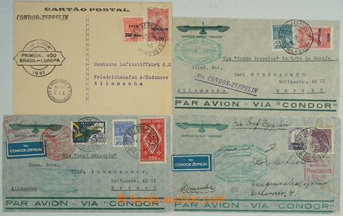 Philately. ZEPPELIN / 4 airmail entires addressed to Germany, delivered by Graf Zeppelin and companies Condor, Lufthansa, flight cachets, zeppelin stamps with overprints; godd condition