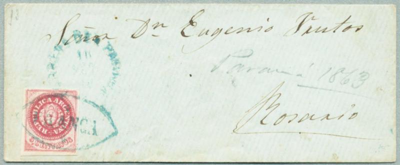 1863, 5 C, rose, Type II without accent on U, on green envelope from PARANA to ROSARIO, cancelled blue FRANCA and dispatch CORREO DE PARANA, fresh and desirable, VF-XF! Estimate 600€.