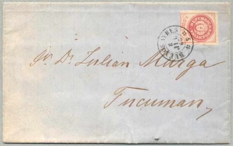 1863, 5c, rose, on letter from Buenos Aires to Tucuman, some aging, good margins at lower sider outer frame is touched, desirable letter, F-VF! Estimate 400€.