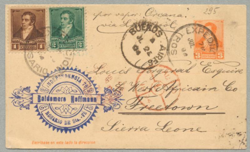 1892-1895, 1 cent, dark brown, 2 cents, dark green, on postal stationery of the corresponding issue, 3 cents, orange, EXPEDICION ROSARIO 2.7.04, sent to Sierra Leone (rare destination) via Liverpool on the steamer Oriana, postal stationery with advertising inscription, Ex Provera, XF! Estimate 300€.