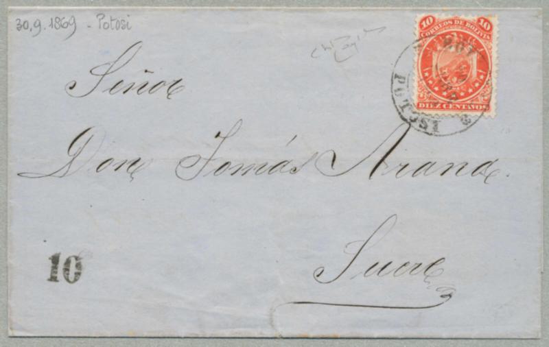 1868-1869, 10 centavos, vermilion, BOLIVIA - POTOSI - 30.9.1869, sent to Sucre, very fresh, ex Provera, XF! Estimate 300€.