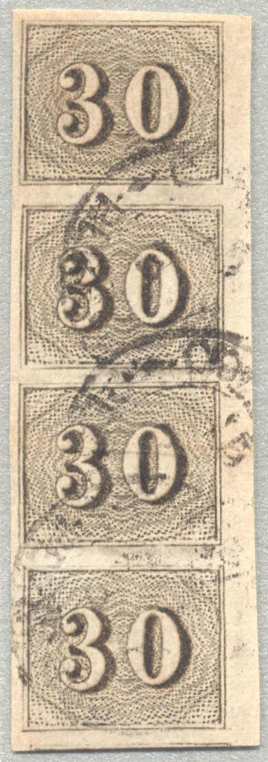 1844-6, 30 rs., black, clear late impression, vertical strip of four, used, good to very wide margins, very attractive, VF-XF! Estimate 200€.
