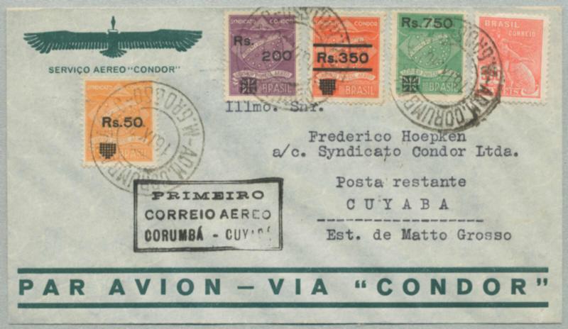 1930, from CORUMBA to CUYABA, flown by Condor Syndicate, franked with five stamps including Condor overprinted stamps in Rs. 50, Rs. 200, Rs. 300, Rs. 350 and Rs. 750 denominations, all tied by AOM. CORUMBA M.GROSSO 16.IX.30 cancels, boxed PRIMEIRO CORREIO AEREO CORUMBA - CUYABA handstamp, printed S