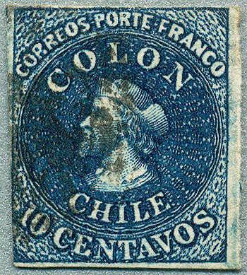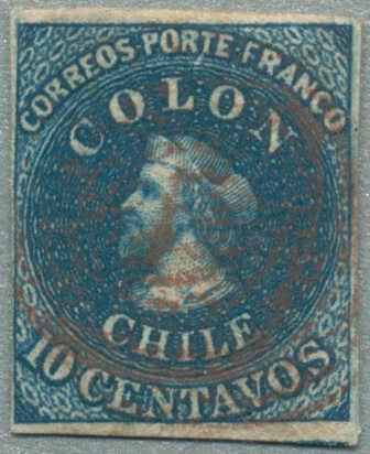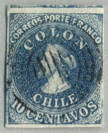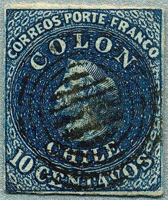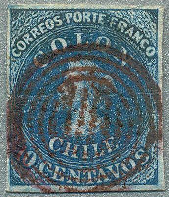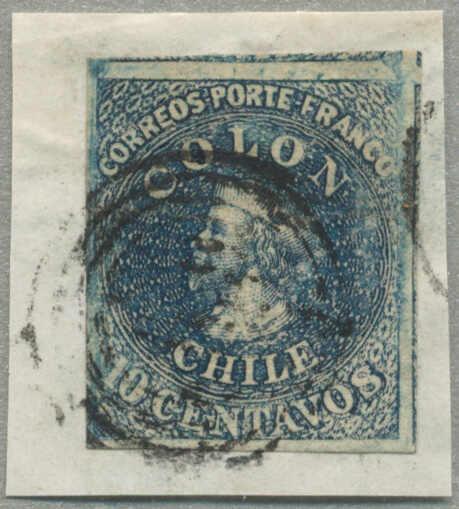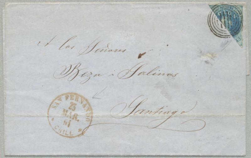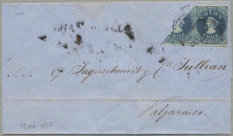 1861, 10 c, deep blue, imperf, on letter from VALPARAISO to SANTIAGO, cancelled black target and red dispatch VALPARAISO, close to large margins, desirable letter, VF-XF! Estimate 800€.