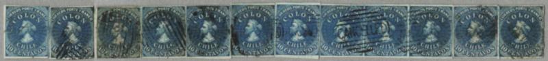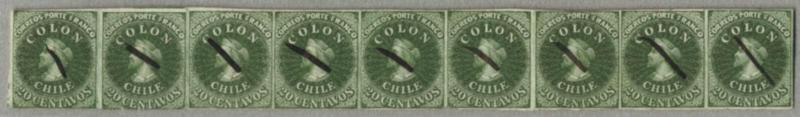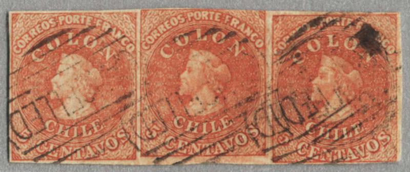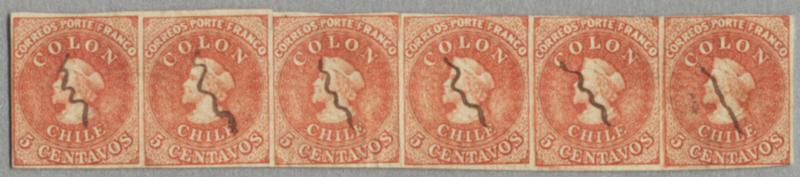 1856-62, 5c., strip of six, dull reddish brown, imperforate, wmk. b, white paper, SANTIAGO print, manuscript cancellation, used, very fresh and desirable, VF-XF! Estimate 290€.
