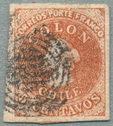 1865, 5 c, red, imperf, very dry print, wmk 5, NG, very interesting and desirable for the Chile specialist, VF-XF! Estimate 200€.