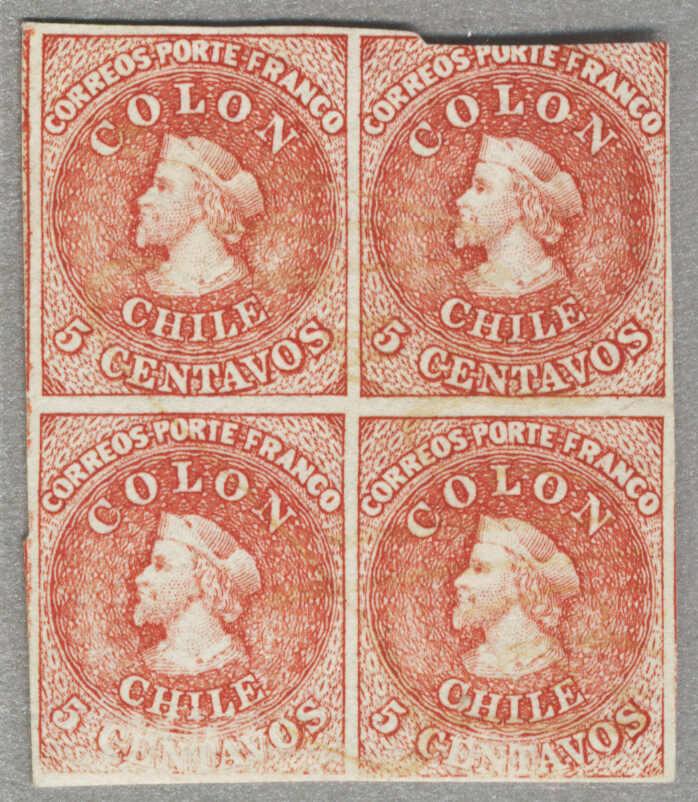 1856-62, 5c., block of four, rose red, imperf. white paper, SANTIAGO print, NG, fresh and desirable, F-VF! Estimate 430€.