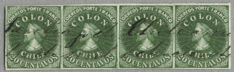 1862, 20c., strip of four, intense green, imperf., wmk. g, LONDON print, manuscript cancel, plate pos. 126-129, used, very fresh and desirable, VF-XF! Estimate 900€.
