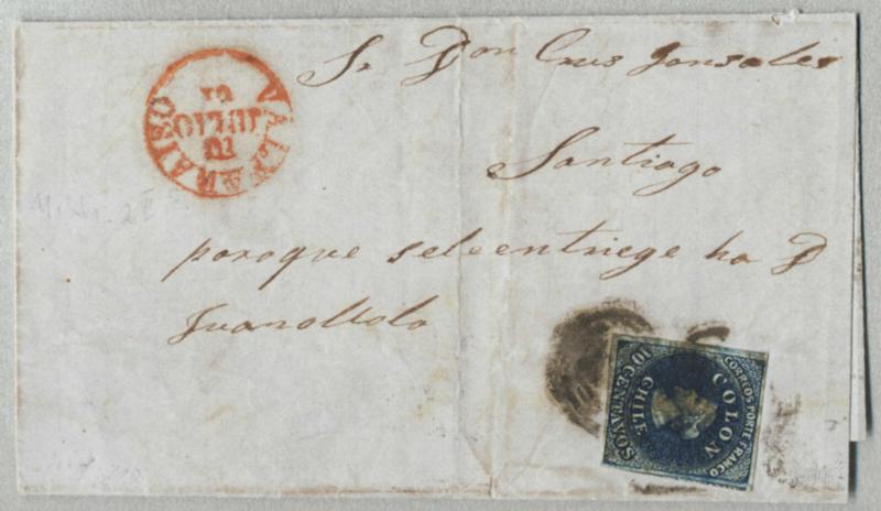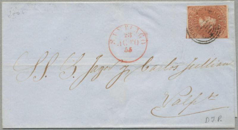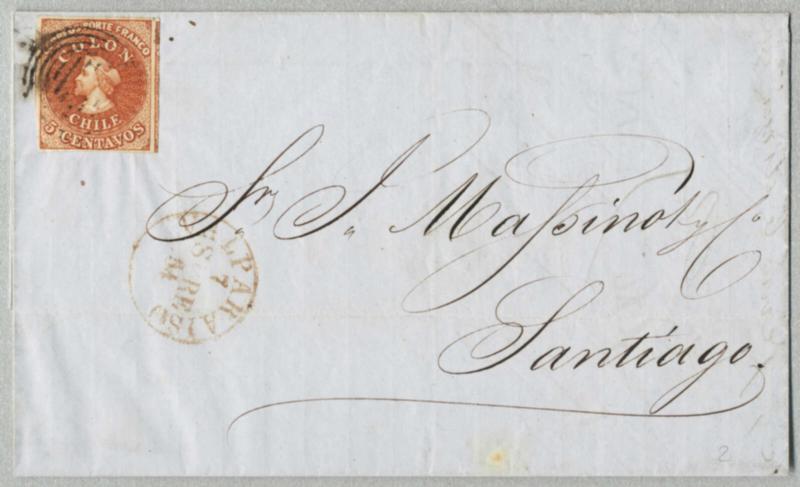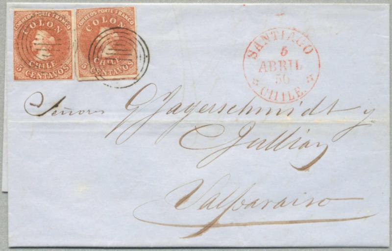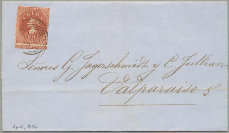 1854, 5 c, pale red brown, imperf, on letter from VALPARAISO to SANTIAGO, cancelled black target and red dispatch VALPARAISO, large margins, desirable letter, VF-XF! Estimate 800€.
