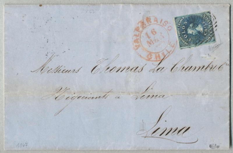 1867, 10 c, blue, imperf, on letter from VALPARAISO to LIMA, cancelled black target and red dispatch VALPARAISO, touched to large margins, desirable letter, VF-XF! Estimate 800€.