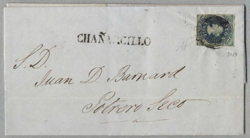 1859, 10 c, blue, imperf, on letter from CHANARCILLO to POTRERO SECO, cancelled black target and dispatch line CHANARCILLO, good to large margins, signed A. Diena, very desirable letter, VF-XF! Estimate 800€.