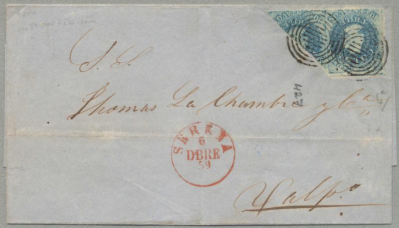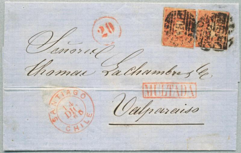 1865, 5+5 C, rose red, on letter from SANTIAGO to VALPARAISO, black cancel, aside cancel red 20, boxed MULTADA and SANTIAGO 14 DIC 65 CHILE, left stamp with small corner crease, good to clear margins, VF! Estimate 900€.