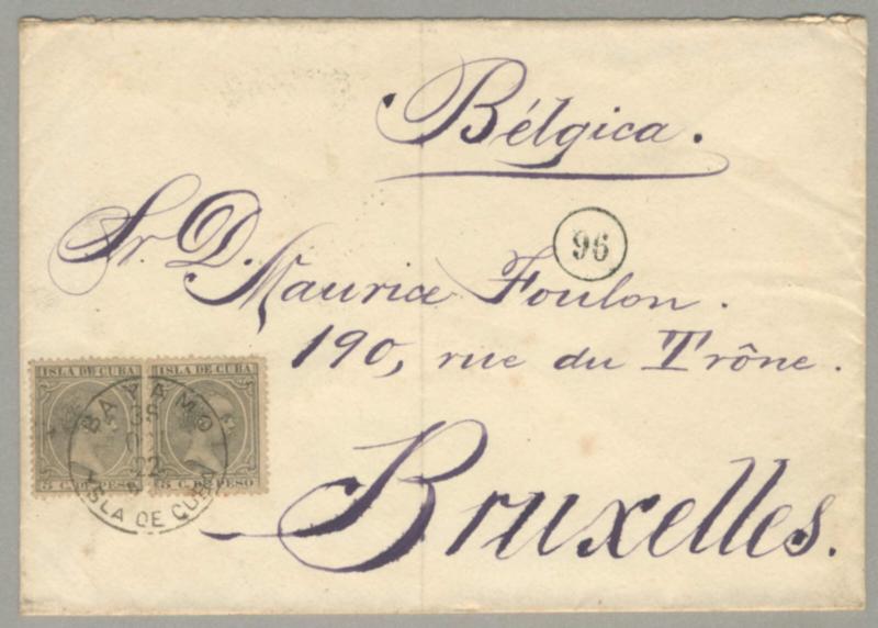 1890, from Bayamo to Bruxelles, franked with pair of 5 centavos de peso Isabella II issue brown gray, perforated, tied by circular BAYAMO ISLA DE CUBA postmarks, transit backstamp HAVANA 2 MAY 90, French maritime transit CHEMIN DE FER 4 MAI 90, arrival backstamp BRUXELLES 14 MAI 90, scarce overseas