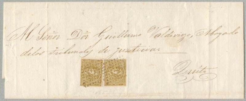 1865-72, 1r, olive yellow, (2), on wrapper to QUITO, cancelled with two dotted Lozenge cancels, margins are good to large all around, ex Provera, fresh and desirable, XF! Estimate 400€.