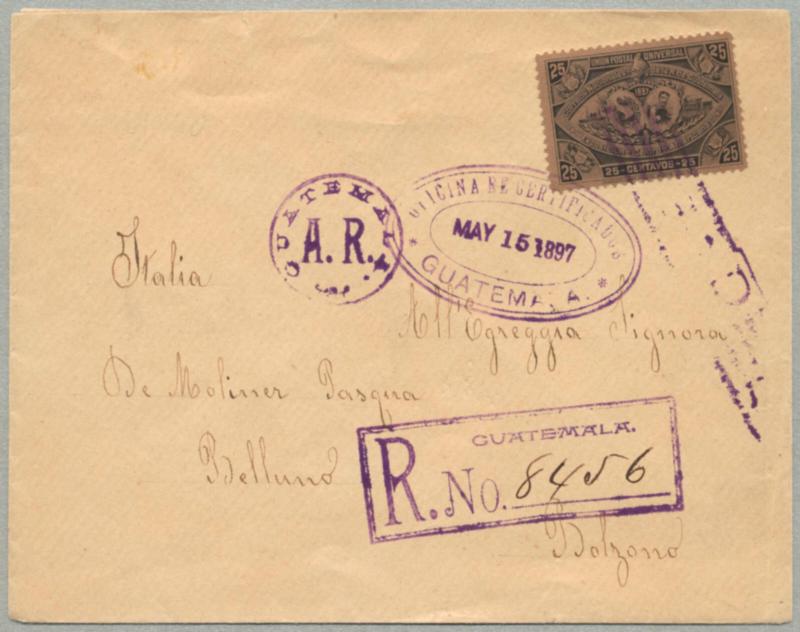 1897, 25 cents, black on grayish brown, issued for the Central American Exhibition, G, OFICINA DE CERTIFICADOS - GUATEMALA - 15.5.1897, A.R. - GUATEMALA, registration mark of Guatemala, sent to Belluno, arrived on June 10, Ex Provera, XF! Estimate 400€.