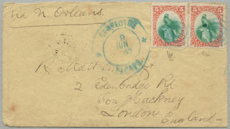 1881, 5+5 centavos, red and green, mute triple-circle cancellation, CORREOS DE - ZACAPA - 9 JUN. 1885, both in green, sent to London, transit postmarks of Livingston, New Orleans, and New York on reverse, arrival postmark of July 13, cert. Holcombe, Ex Provera, XF! Estimate 400€.