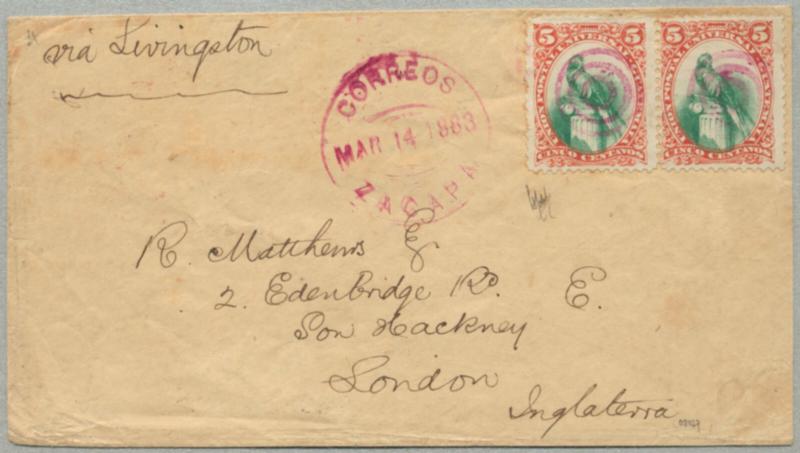 1881, 5 centavos, red and green, pair, mute triple-circle cancellation, CORREOS - ZACAPA - MAR 14 - 1883, both in lilac, transit postmark of New Orleans on reverse, arrival postmark of London, cert. Holcombe, Ex Provera, XF! Estimate 600€.