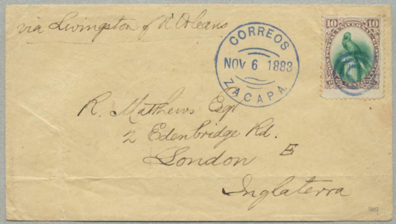 1881, 10 centavos, violet and green, mute double-circle cancellation, CORREOS - ZACAPA - NOV. 6.1883, both in blue, sent to London with arrival postmark of December 4, Ex Provera, XF! Estimate 300€.