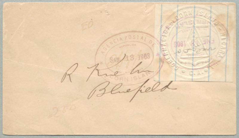 1903, from CORN ISLAND to BLUEFIELDS, franked with a 5 c provisional adhesive made by embossing the CORN ISLAND government seal on lined paper, two violet oval cancellations reading AGENCIA POSTAL DE CORN ISLAND FNE 13 1903 and AGENCIA POSTAL DE CORN ISLAND SAB 13 1903, on reverse with 3400 transit