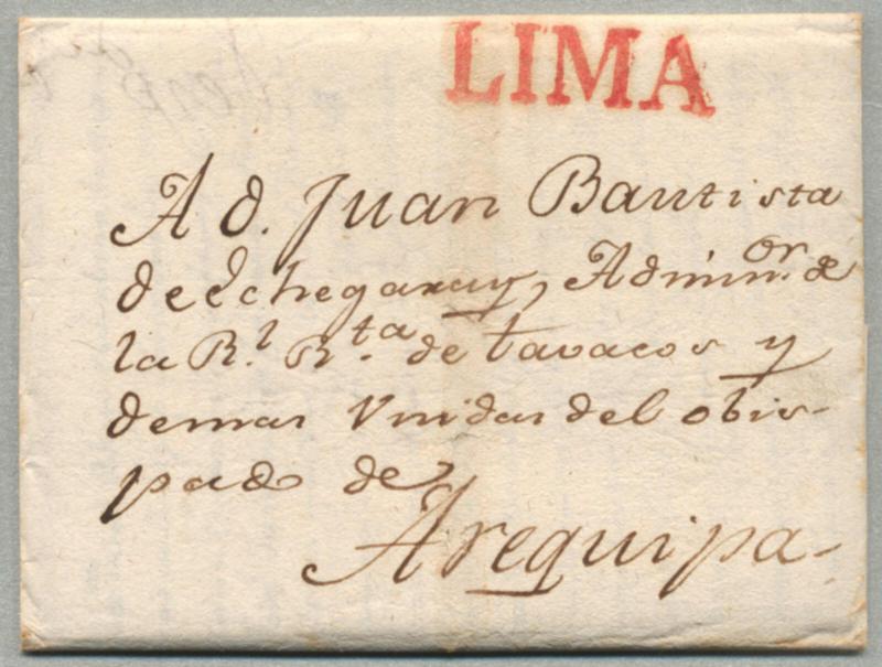 1799, Pre-philatelic cover from Lima, August 27, 1799, to Arequipa, LIMA in red (Type 6 75p.), interesting content, Ex Provera, XF! Estimate 300€.
