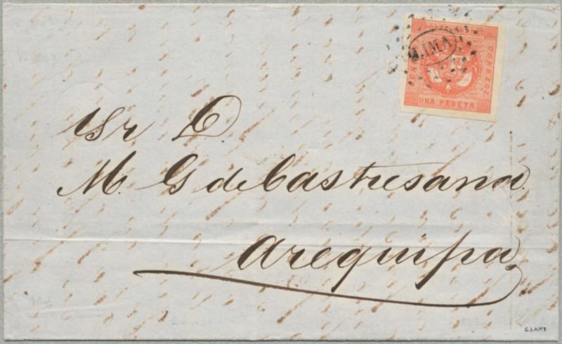 1858, 1p, rose red, on letter from LIMA to AREQUIPA, ex Harmers London, signed G. Lamy, all margins, very fresh and attractive, XF! Estimate 600€.
