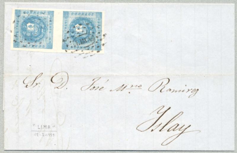 1858, 1d, deep blue, pair, imperf, on letter from LIMA to ISLAY, cancelled oval dotted LIMA, large even margins all around, ex Provera, excellent condition, fresh and desirable, VF-XF! Estimate 800€.