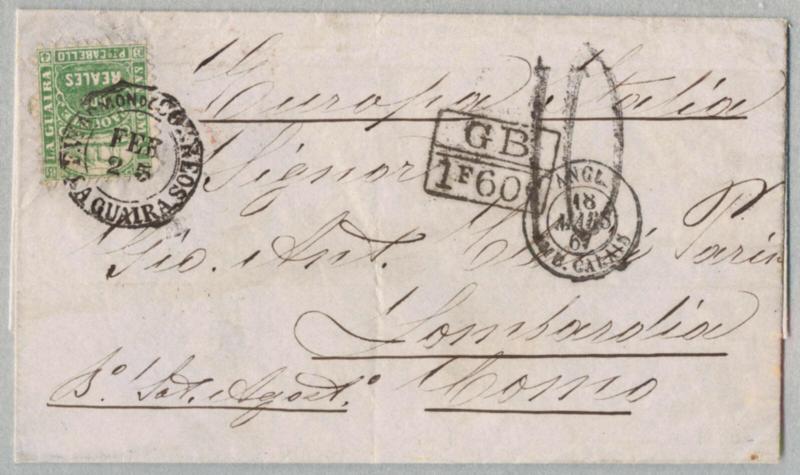 1867, Local issues Venezuela, La Guaira, private yacht line, 2r, green, on letter from LA GUAIRA to COMO/Italy via LONDON and CALAIS, tax remark 10 in black, boxed GB and CALAIS cancel, reverse with multiple transitional and arrival cancel in red COMO, exceptional rare letter, VF! Estimate 4.000€.