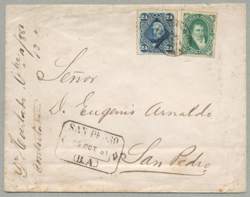 1878, 24 cents, blue, 16 cents, green, SAN NICOLAS - B.A - 4.10.1881, with arrival postmark of SAN PEDRO on the 25th, double registered postage for domestic mail (40 cents), Ex Provera, XF! Schätzpreis 200€.