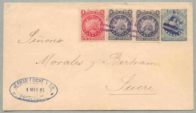 1887, 1 cent, pink, 2 cents/violet/pair additional on 5-cent blue postal stationery envelope, mute violet cancellation, sent from Cochabamba to Sucre, 1.5.1891, Ex Provera, XF! Schätzpreis 200€.