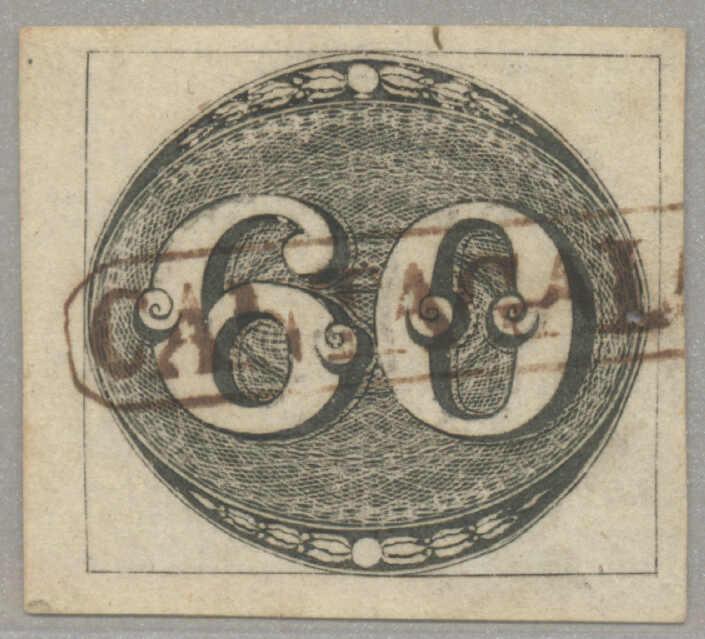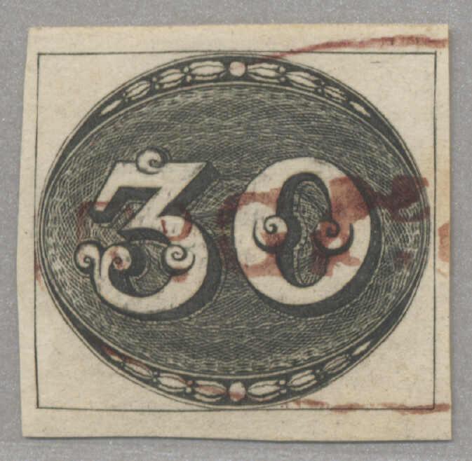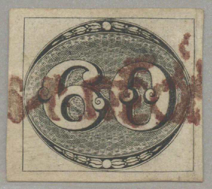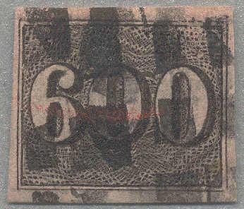 1850, 600 R., black, broken right lower corner, used with fancy cancel and additional light red cancel, good to wide margins and attractive, VF! Schätzpreis 100€.