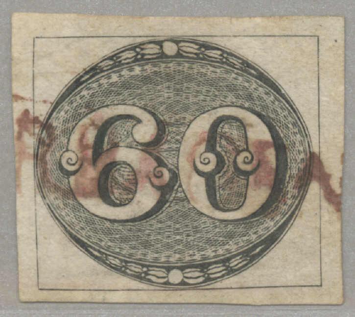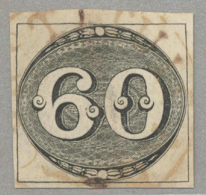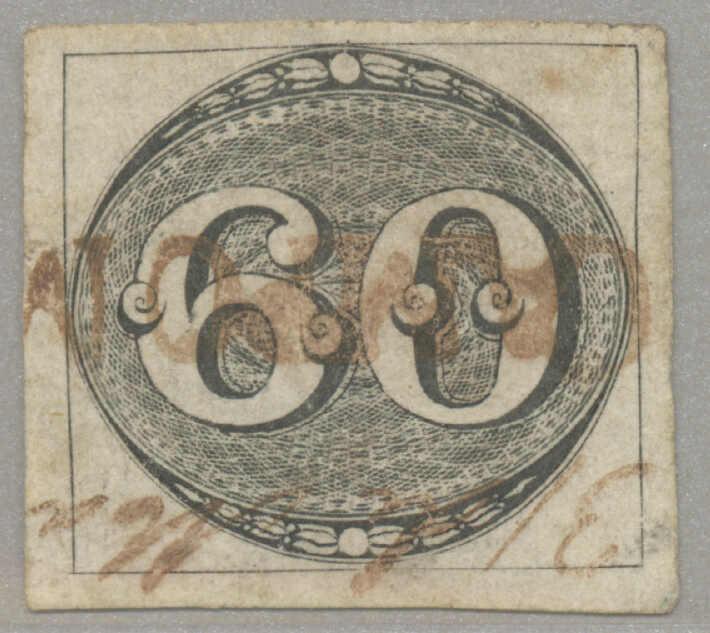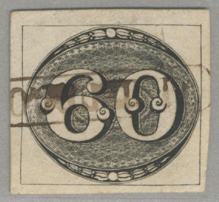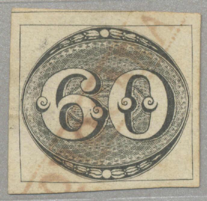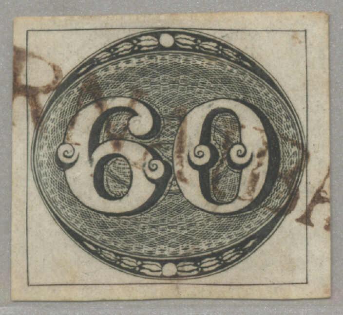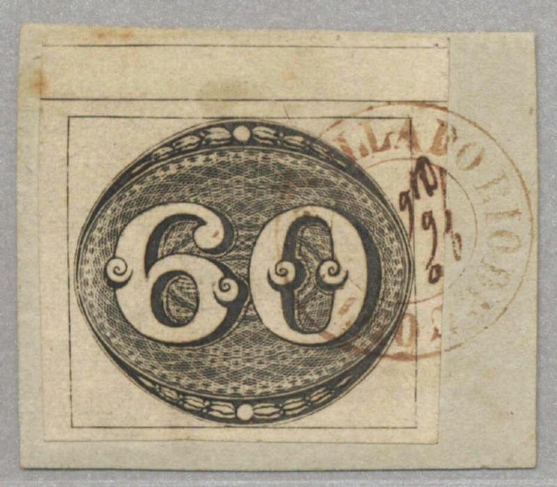 1843, 60r., grey black, worn impression, used (PAT)Y DO ALFER(ES) (RJ), (Ayres 1161), three tiny pin holes from ink erosion, close to good margins, VF-XF! Schätzpreis 2.000€.
