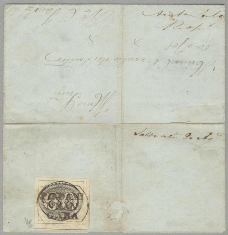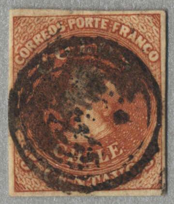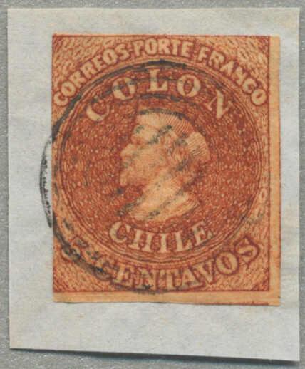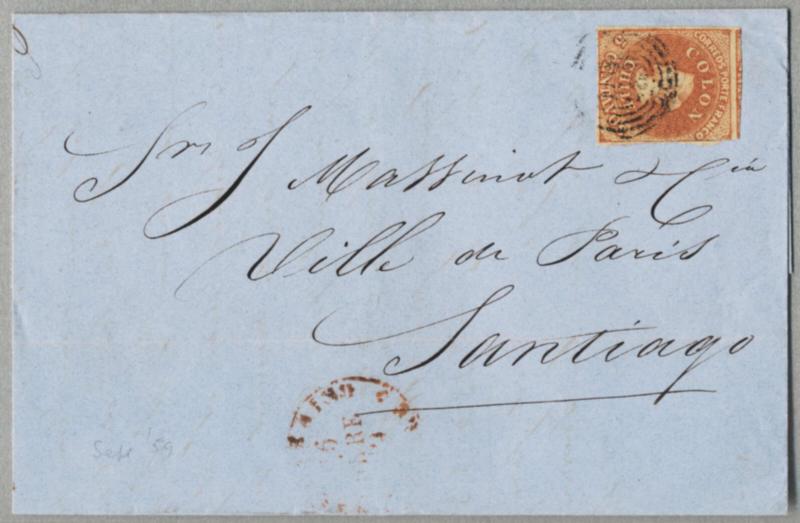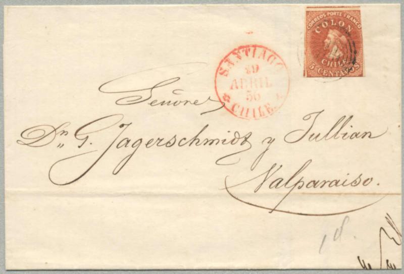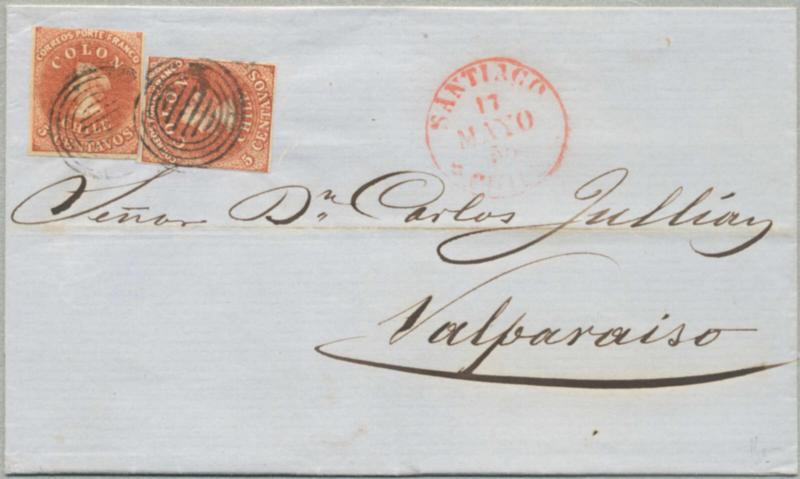 1854, 5 c, pale red brown, imperf, on letter from VALPARAISO to SANTIAGO, cancelled black target and red dispatch VALPARAISO, large margins, desirable letter, VF-XF! Schätzpreis 800€.