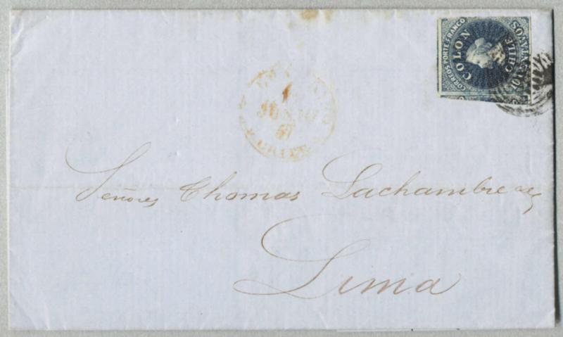 1867, 10 c, blue, imperf, on letter from VALPARAISO to LIMA, cancelled black target and red dispatch VALPARAISO, touched to large margins, desirable letter, VF-XF! Schätzpreis 800€.