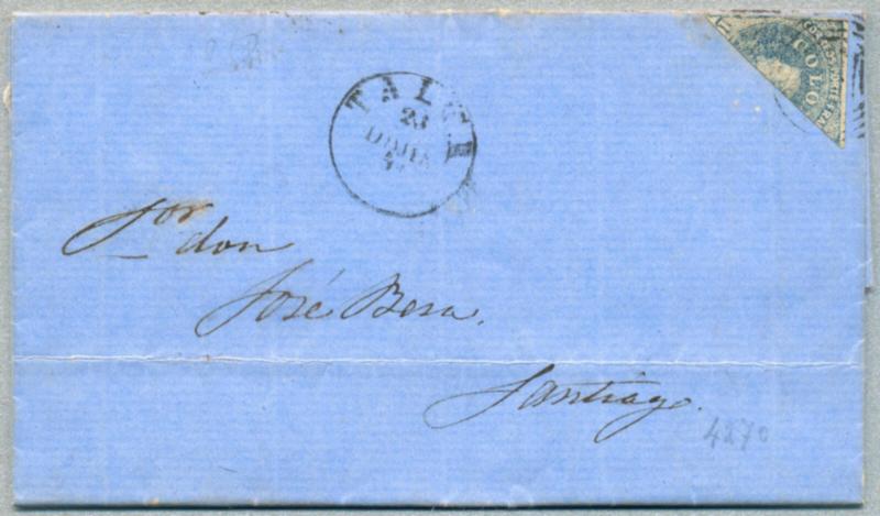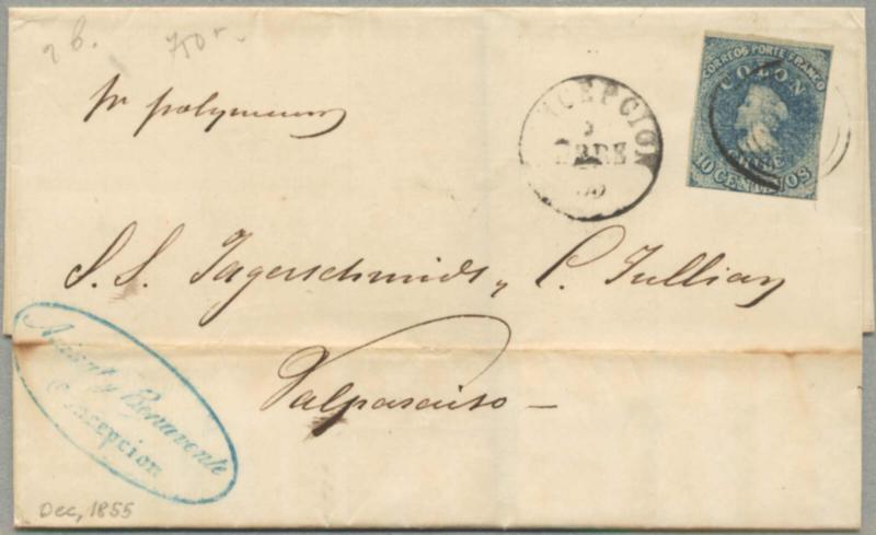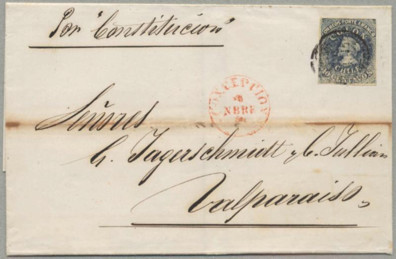 1861, 10 c, deep blue, imperf, on letter from VALPARAISO to SANTIAGO, cancelled black target and red dispatch VALPARAISO, close to large margins, desirable letter, VF-XF! Schätzpreis 800€.