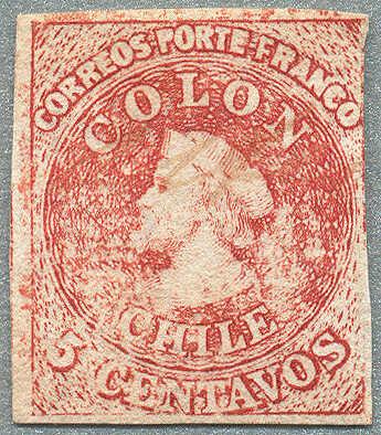 1865, 5 c, red, imperf, very dry print, wmk 5, NG, very interesting and desirable for the Chile specialist, VF-XF! Schätzpreis 200€.